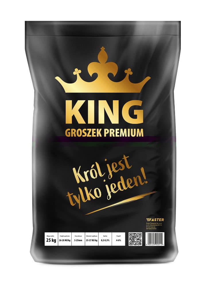 King Groszek Premium to sprawdzony ekogroszek o wysokiej wydajności energetycznej i czystym spalaniu. Worki po 25 kg ułatwiają przechowywanie i codzienne użytkowanie. Parametry: wartość opałowa 25–27 MJ/kg, granulacja 5–25 mm, niska zawartość siarki (<0,5%) i ograniczona ilość popiołu (4–6%). To gwarancja efektywnego ogrzewania przy niższym zużyciu opału.