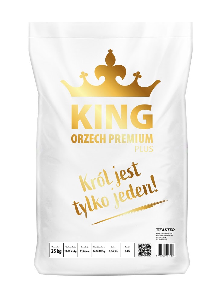 King Orzech Premium Plus to węgiel wysokiej jakości pakowany w worki po 25 kg, co zapewnia wygodę w transporcie i składowaniu. Charakteryzuje się bardzo dobrą wartością opałową (26–28 MJ/kg), niską zawartością popiołu (2–4%) i minimalną ilością siarki (<0,5%). Idealny dla gospodarstw domowych oraz większych instalacji grzewczych, które stawiają na wydajność i czystość spalania.